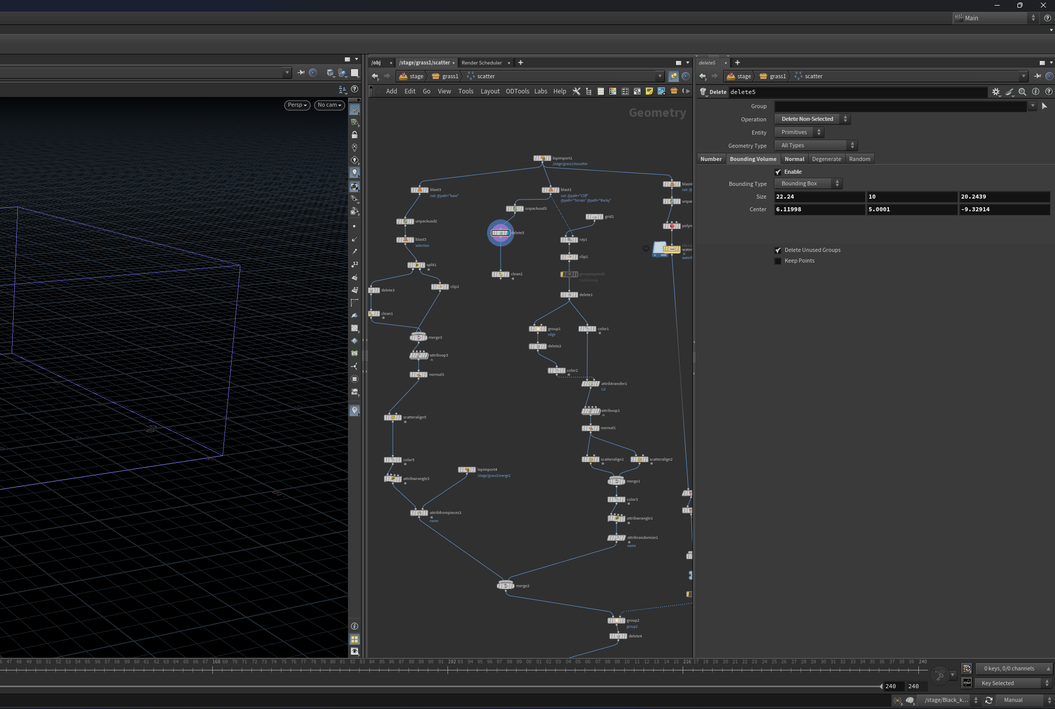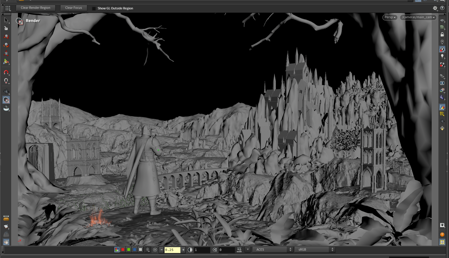 Подготовка ассетов к работе, домоделинг, настройки и фиксы, создание гор и простой моделинг, скаттеры, трава, камни, деревья. Прокси и рендер назначения, оптимизация сцены, чтоб не крашнуть гудини с первых минут работы в сцене и в будущем когда обрастет миллионами обьектов.