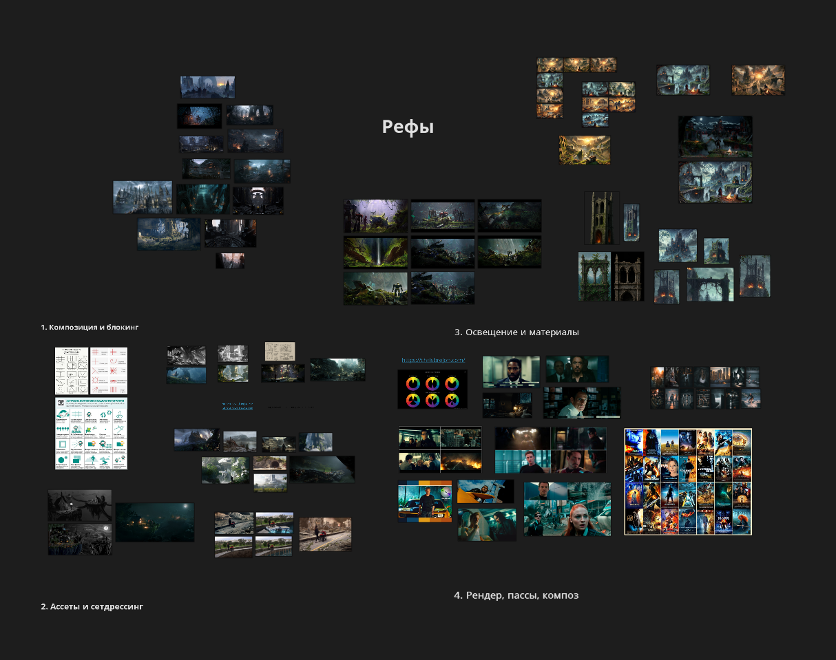 Но начну с самого главного, это с подготовки к проекту, рефы и раскадровки. Затрону теорию и творческие моменты, композиция кадра, цвет и свет, то что и ценится больше всего в крупных студиях, а то техническое тыкания кнопок и слайдеры и параметры. Насмотренность и видение кадра и картинки гораздо важнее чем софт, про это буду отдельно рассказывать, насколько это ценится в студиях, и что вас все равно будут переучивать первые недели а то и месяца под свои тулзы и воркфлоу, которые в каждой компании свои и все ваши знания софта пойдут по одному месту.